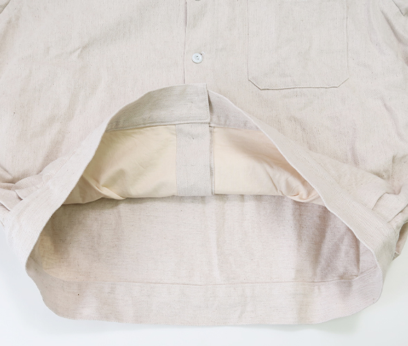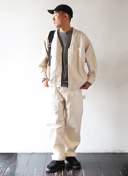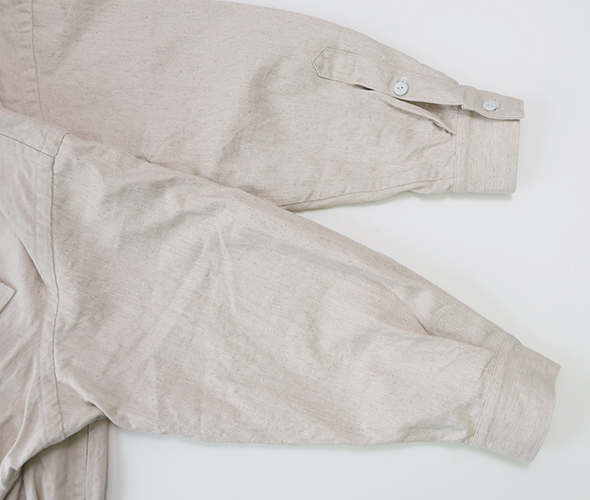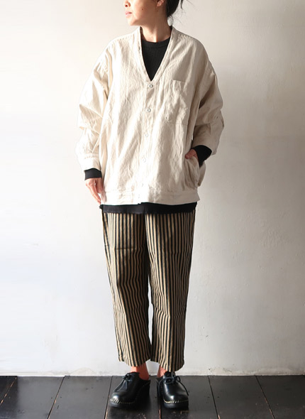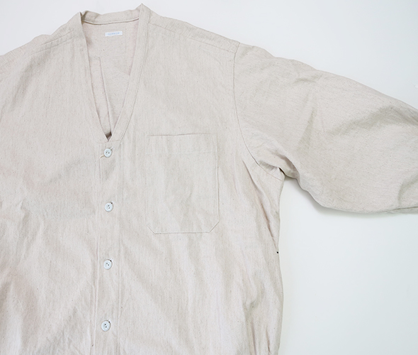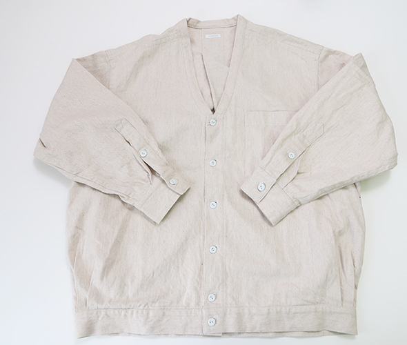 ゆったりしたリラックスシルエットのブルゾンライクなシャツカーディガン。直線的に設計された前立てが特徴で、サイドに配されたギャザーにより後ろにボリュームが溜まり、丸みのあるシルエットに。素材には、コットン・リネンの10オンスデニムを使用し、タフさと軽やかさがあり着込むほどに増す風合いも魅力的。季節の変わり目はもちろん、ロングシーズン着用いただけるアイテムです。