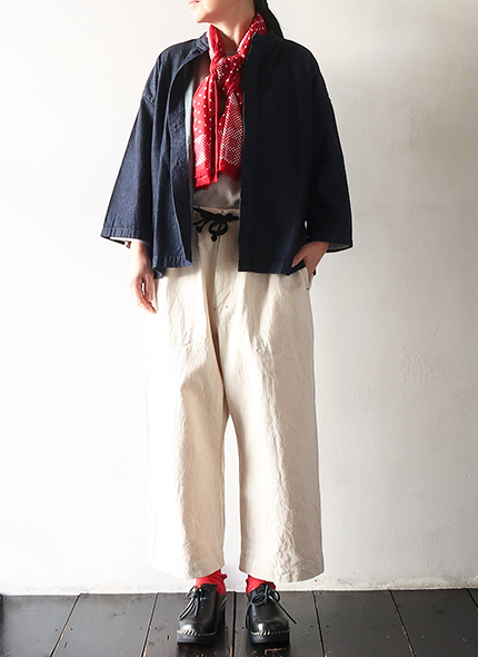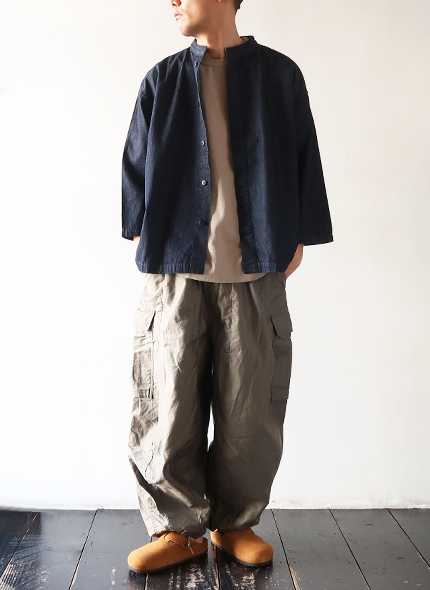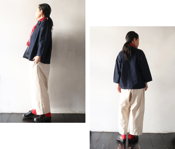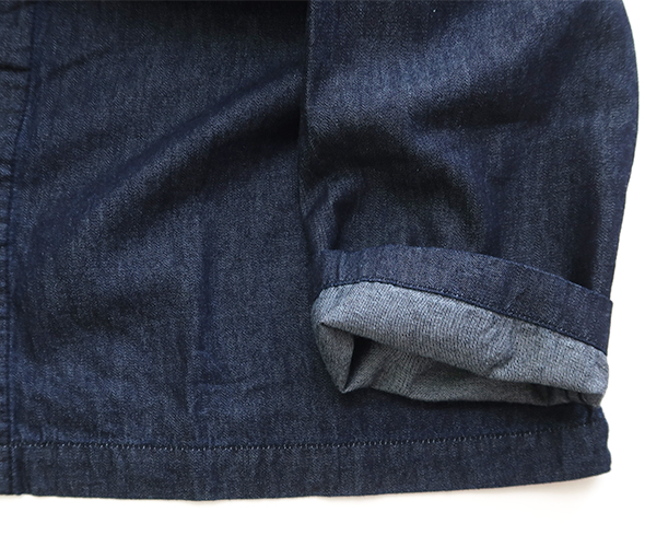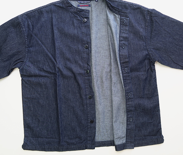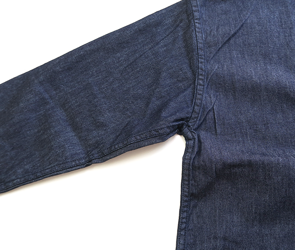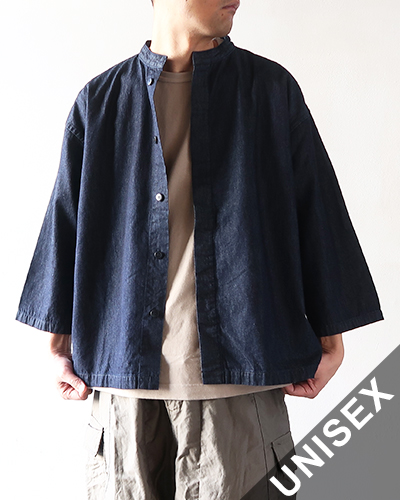 素材は薄手で軽くしなやかな生地感の6オンスデニムで、少し立ち上がった首元にゆったりとした身幅のヤッコシャツ。比翼式の前開きタイプで、一枚ではもちろんインナーから羽織まで幅広く使い易い一着です。