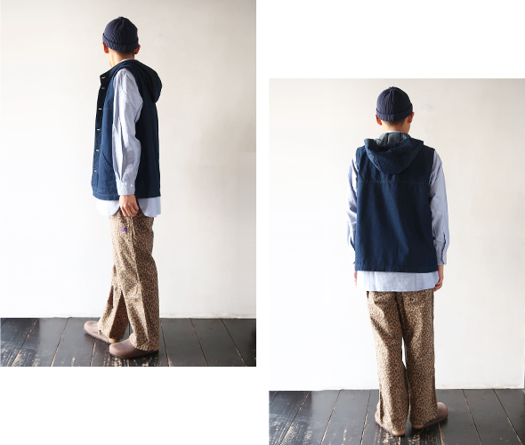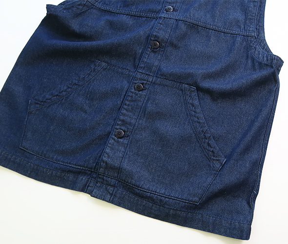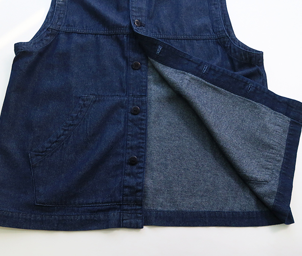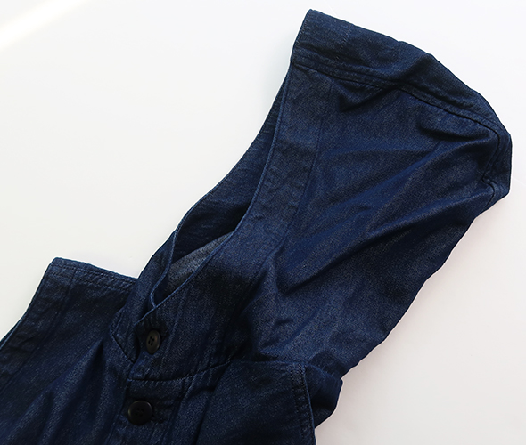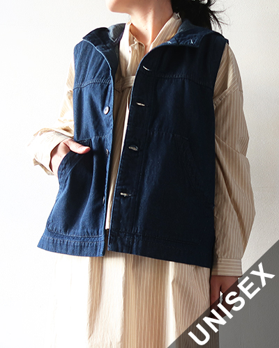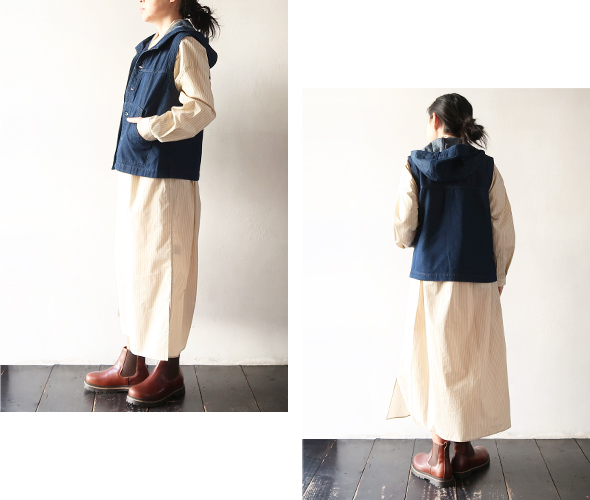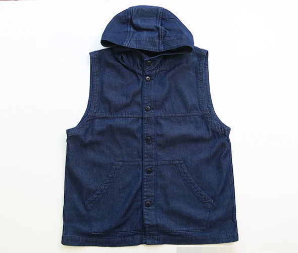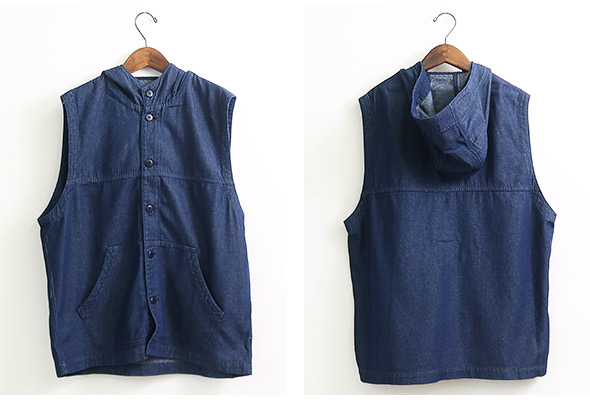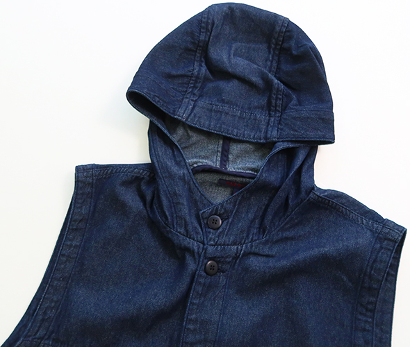 切り替えとフロントに配されたポケットがポイントになった、前開きタイプのフード付きベスト。程良い厚さの7オンスデニムを使用しており、軽やかな着心地でレイヤードしやすく、季節の変わり目はもちろん、ロングシーズン活躍するアイテムです。いつものスタイリングに程よくアクセントを加えてくれ、着込むほどに増していく風合いも魅力。