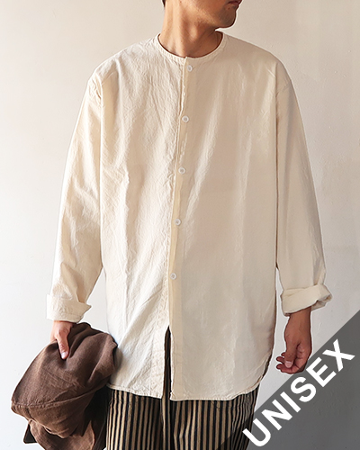 TENDER Co. でメインラインのEDIT TAIL SHIRTをぐっとシンプルに仕上げた、COLLARLESS TAIL SHIRTS COTTON CALICO。洗いのかかったキャリコ地で、着込む程馴染みの良い素材感になります。衿やポケット、袖口の釦がなく着丈が長めの特徴的なデザインで、一枚でサラッと着用いただくのもいいですが、ジャケットやざっくりとしたニットなどとのコンビネーションは抜群です。