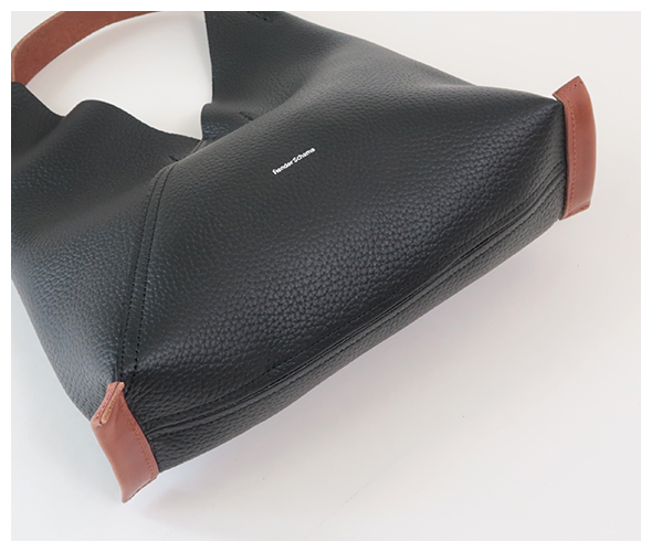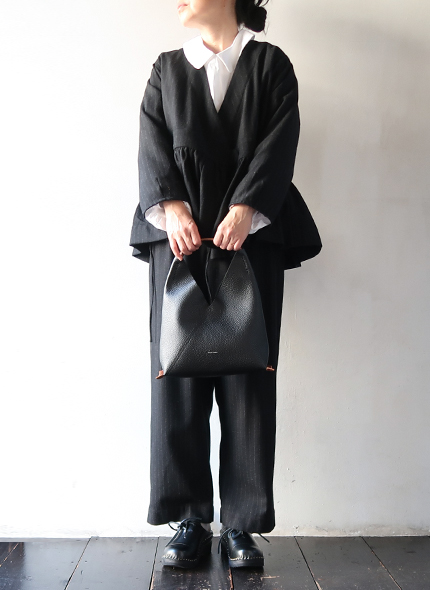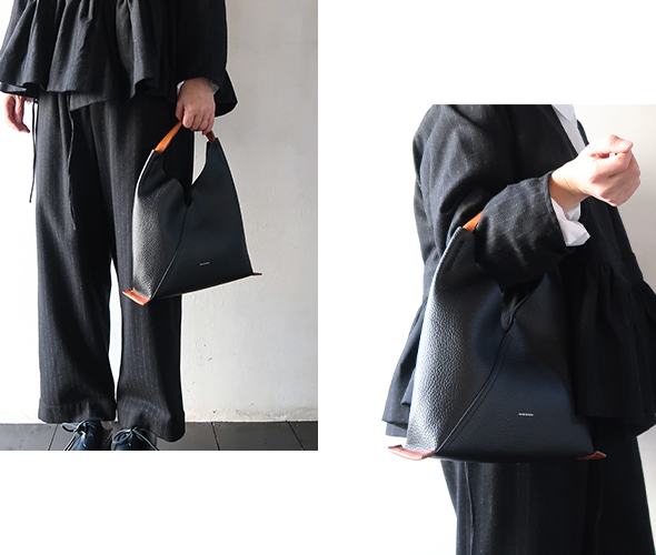 柔らかさと弾力を持ち、細やかな美しいシボ感のあるカウレザーを使ったトライアングルバッグ(triangle bag)。マグネット開閉式を採用し、スマートで実用的なサイズ感に仕上がっています。ハンドル部分には、オイルをたっぷりと含んだイタリア産バケッタレザーが使用されており、昔ながらの製法によるこの素材は、使用するほどに手に馴染み、柔らかさと色の深みが増していきます。