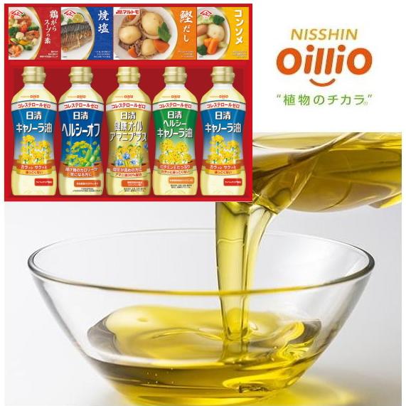 ●日清キャノーラ油350g×2、日清ヘルシーキャノーラ油350g・日清ヘルシーオフ350g・日清健康オイルアマニプラス350g・マルトモ直火焼本かつおだしの素(顆粒)50g・焼塩(20g×3)・コンソメ(顆粒)(8g×4)・鶏がらスープの素(顆粒)(8g×4)×各1