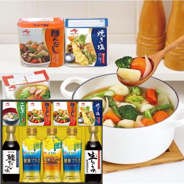 内容 ほんだし48g×2、こんぶだし48g、瀬戸のほんじお80g、キャノーラ油350g×2、キャノーラ油&コーン油350g、ヤマキ鰹だしつゆ360ml、正田本醸造丸大豆 生しょうゆ360ml 【アレルゲン:乳・小麦・大豆】