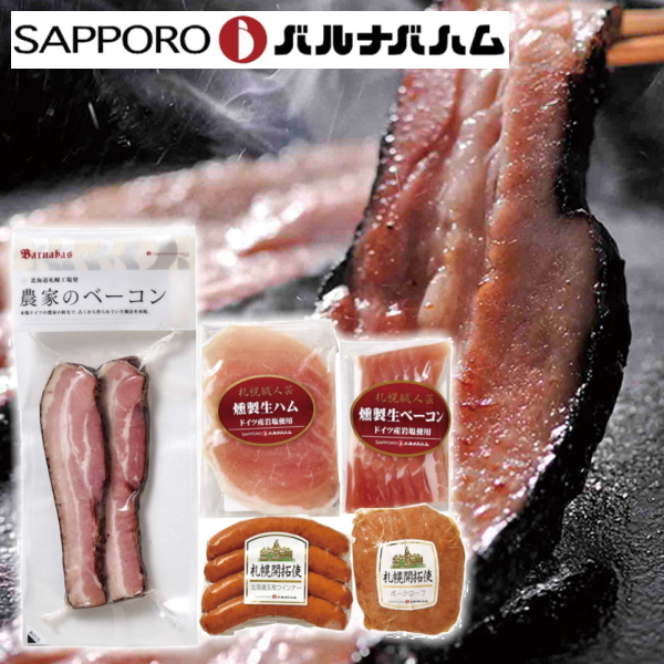 【商品内容】農家のベーコンステーキカット/126g、玉葱ウインナー/100g、燻製生ハム・燻製生ベーコン/各40g、ポークローフ/170g