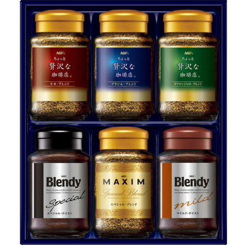 内容 * マキシム(スペシャルブレンド)(65g)×2、ちょっと贅沢な珈琲店(ブラジルブレンド・モカブレンド・キリマンジャロブレンド)(各65g)・ブレンディ(スペシャルテイスト)(70g)×各1
