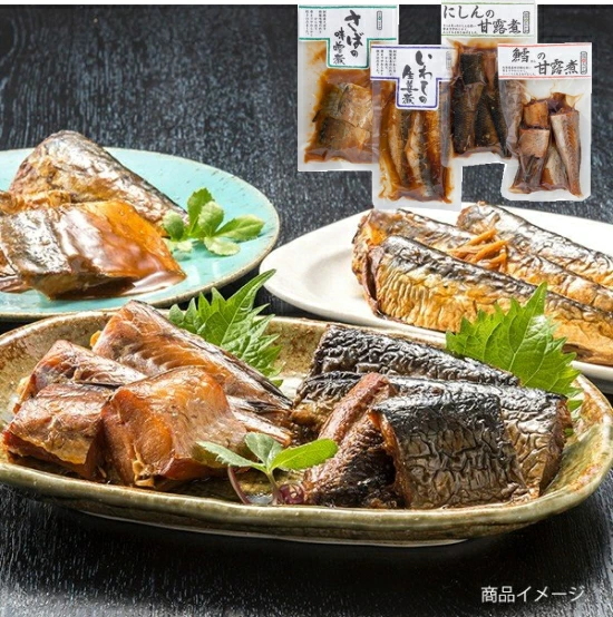 商品説明:さばの味噌煮/3切、いわしの生姜煮/3尾、にしんの甘露煮・鱈の甘露煮/各180g