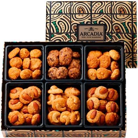 内容:アルカディア(アーモンド)(65g)・アルカディア(マカデミアナッツ)(40g)×各2、アルカディア(カシューナッツ)(65g)・アルカディア(チョコレートチップ)(40g)×各1