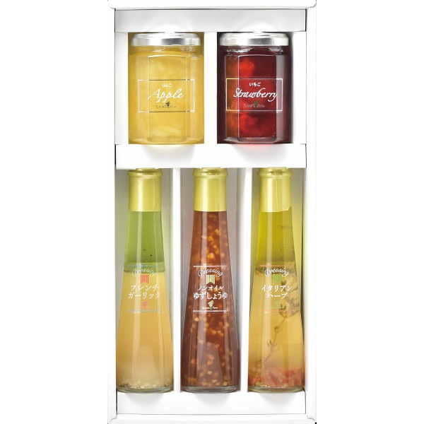 内容 ●ジャム145g×2(りんご、いちご)、ドレッシング122ml×3(フレンチガーリック、ノンオイルゆずしょうゆ、イタリアンハーブ)