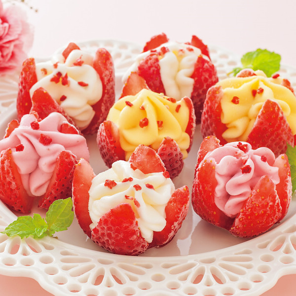花のように開いた博多あまおうの中に練乳、イチゴ、マンゴーの3種類のアイスを絞り、苺のフリーズドライをトッピング。