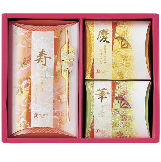 伝統の友禅模様の化粧箱に、かつお花削り・ソフトふりかけ鰹とごま・のり茶漬け・わさび茶漬けの詰合せ。