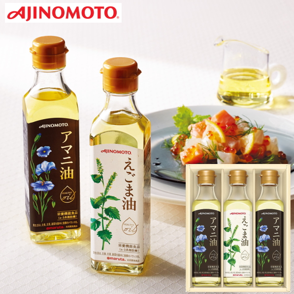 ●商品内容 ●えごま油180g×1、アマニ油180g×2 ●パッケージサイズ:17.1×20.7×5.5 cm ●賞味期限:製造日より480日 さまざまな有用性を持つ"オメガ3系脂肪酸"を豊富に含む、えごま油とアマニ油を詰め合わせた健康オイルギフトです。健康を気遣う方にピッタリな話題の贈り物です。