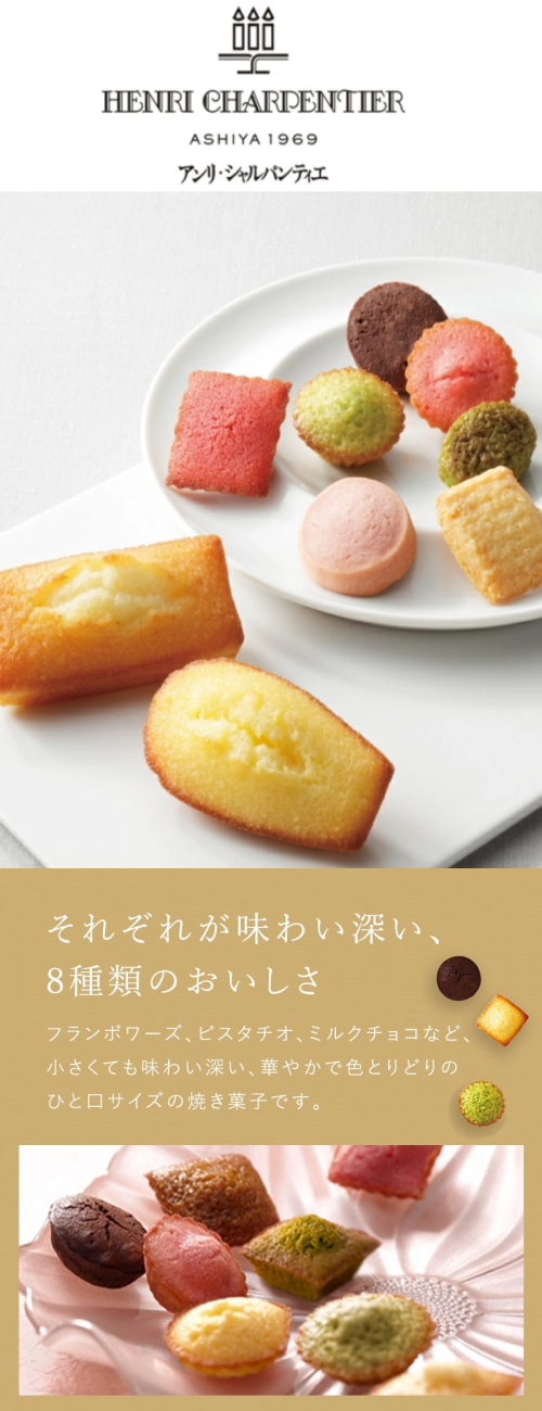 アンリ・シャルパンティエの代表商品のフィナンシェ、マドレーヌに加え、フランスで愛されるバラエティ豊かな味をひと口で楽しめる焼き菓子です。