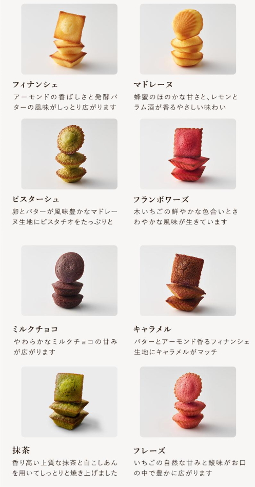 ●プティ・ガトー・アソルティ(フィナンシェ・マドレーヌ・キャラメル・抹茶×各2、ピスターシュ・フランボワーズ・ミルクチョコ・フレーズ×各1)