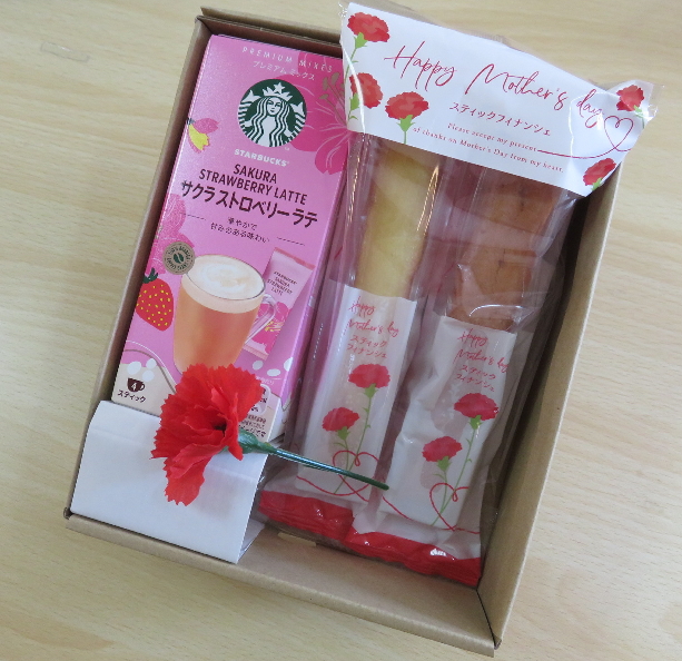 しっとりとしたスティックフィナンシェのプレーンとストロベリーをカーネーションのラッピングにして スターバックスとセットにしました。