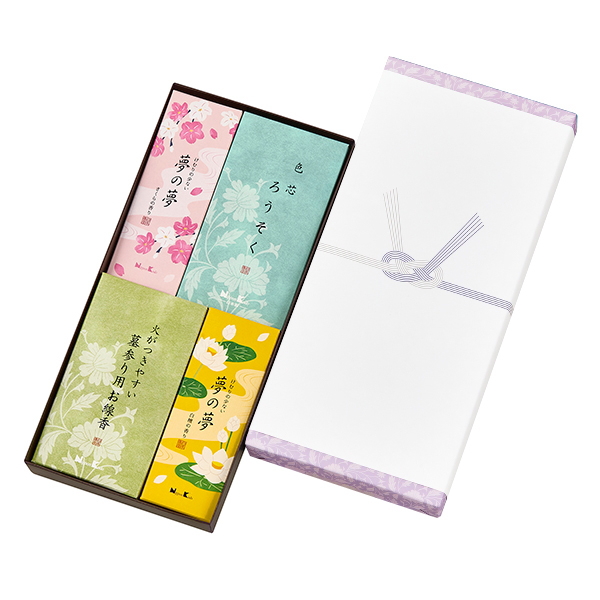 商品内容:夢の夢さくら・夢の夢白檀(約40g)・火がつきやすいお墓参り用お線香(4本)・色芯ローソク(約50g)×各1