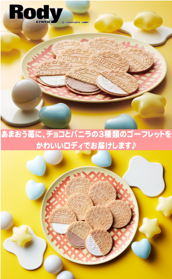 あまおう苺に、チョコとバニラの3種類のゴーフレットをかわいいロディでお届けします