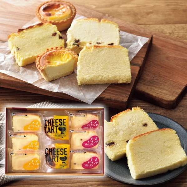 【商品内容】チーズパウンドケーキ・チーズパウンドラムレーズン・チーズタルト/各3個