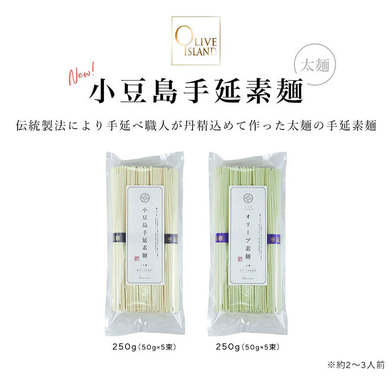 ■栄養成分表示目安(※100g当たり)…【小豆島手延素麺(太麺)】エネルギー:346kcal、たんぱく質:10.0g、脂質:2.4g、炭水化物:71.1g、食塩相当量:5.3g【小豆島手延オリーブ素麺(太麺)】エネルギー:339kcal、たんぱく質:10.5g、脂質:1.6g、炭水化物:70.6g、食塩相当量:5.59g