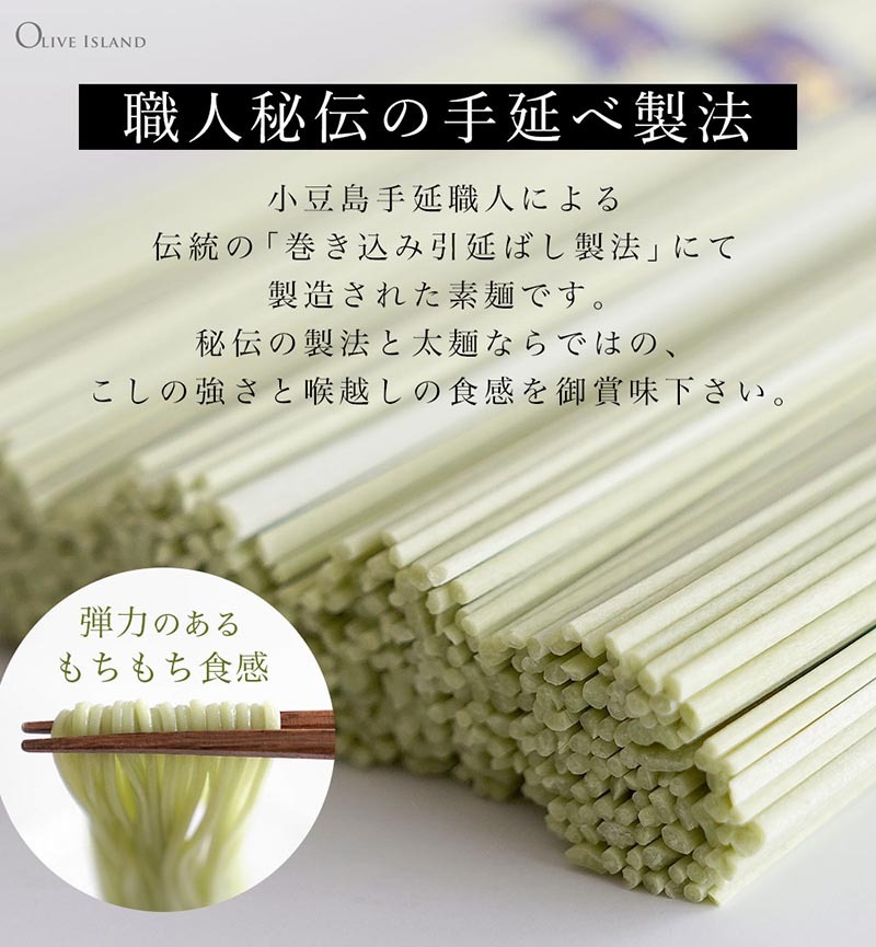 この環境で生まれた小豆島手延素麺は、奈良県「三輪そうめん」、兵庫県「揖保乃糸」に並ぶ日本三大素麺の一つとなりました。 三大素麺の中でも、さずが讃岐うどんの祖先「小豆島素麺」は、特に弾力と歯ごたえがあり、通常の素麺と違い食べ応えもあることから、食べた後の満足度が格段に違います。