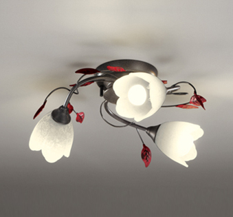 ●草花をモチーフにした、優美なアームが印象的なシャンデリア。くすんだ赤をアクセントにしたダークな色合いに、落ち着いた女性らしさが漂います。