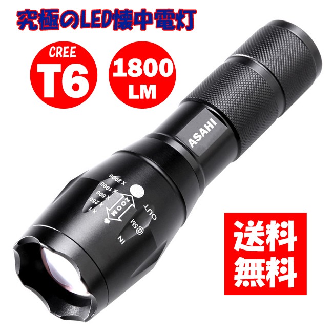 LEDハンディライトASAHI ハンドライト LED 防水 1800ルーメン 広角 ズーム XM-L T6 LEDライト ライト 懐中電灯防災 防犯 強力LED 電池式 【期間限定】送料無料