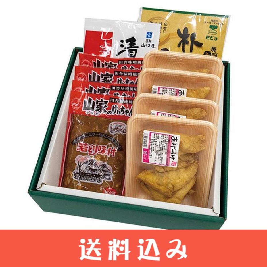 | 製造者 | 【あげづけ】 株式会社古川屋 岐阜県高山市冬頭町42番地 【山家けいちゃん】 有限会社荘川山家料理本舗 岐阜県高山市荘川町黒谷1番地の1 【朴葉みそ】 船津醤油株式会社 岐阜県飛騨市神岡町船津1365 【漬物ステーキ】 (株)飛騨山味屋 岐阜県高山市西之一色町3-8 |