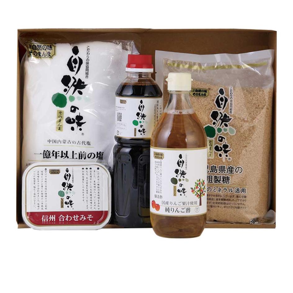 | 内容量 | 砂糖: 700g 一億年以上の前の塩: 1kg 醤油: 500ml 信州合わせみそ: 450g りんご酢: 500ml |