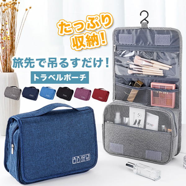 トラベルポーチ 吊り下げ 収納 旅行 フック付き 化粧ポーチ コスメ 自立 大容量