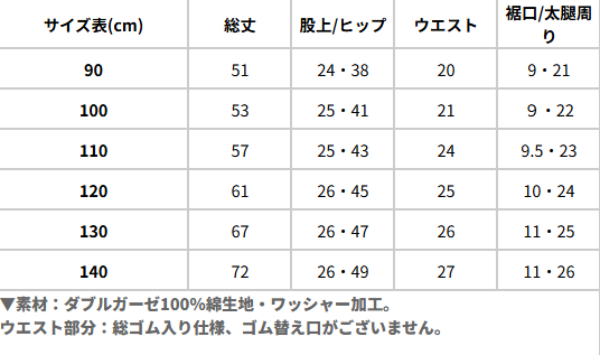 90サイズ:総丈51cm、股上24cm、ヒップ38cm、裾口9cm、ウエスト平置20cm、太腿周り21cm100サイズ:総丈53cm、股上25cm、ヒップ41cm、裾口9cm、ウエスト平置21cm、太腿周り22cm110サイズ:総丈57cm、股上25cm、ヒップ43cm、裾口9.5cm、ウエスト平置24cm、太腿周り23cm120サイズ:総丈61cm、股上26cm、ヒップ45cm、裾口10cm、ウエスト平置25cm、太腿周り24cm130サイズ:総丈67cm、股上26cm、ヒップ47cm、裾口11cm、ウエスト平置26cm、太腿周り25cm140サイズ:総丈72cm、股上26cm、ヒップ49cm、裾口11cm、ウエスト平置27cm、太腿周り26cm