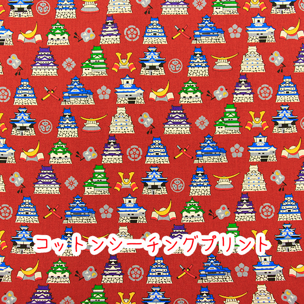 在庫限り「お城OSHIRO」レッド コットンシーチングプリント