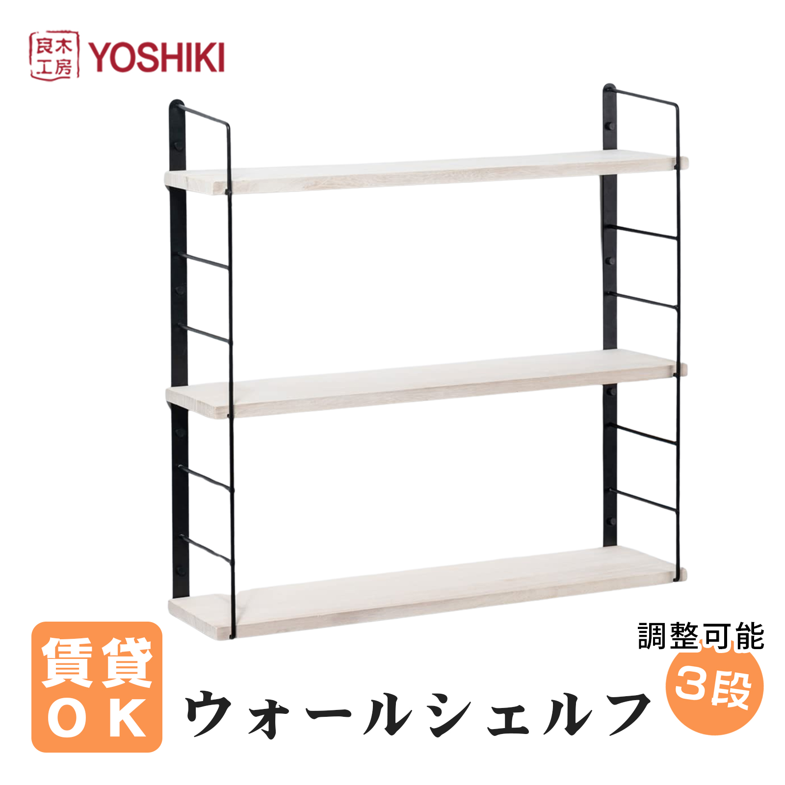 木製ウォールシェルフ 3段 壁掛け 棚 賃貸OK 石膏ボード対応 高さ調整 YK-WS3