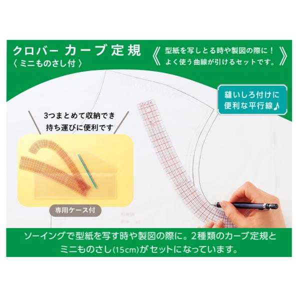 型紙を写しとる時や製図の際に、2種類のカーブ定規とミニものさし(15cm)がセットになっています。