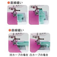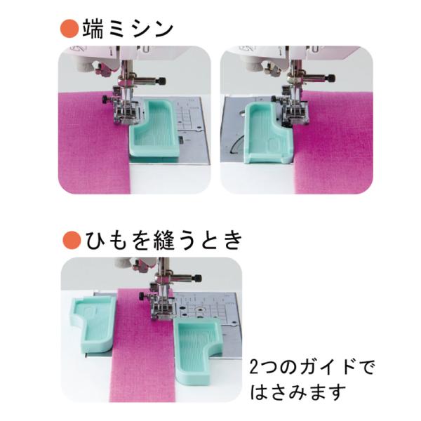 ガイドの向きや組み合わせで、「直線縫い」、「曲線縫い」、「端ミシン」、「ひもを縫うとき」とさまざまな縫い方に対応できます。