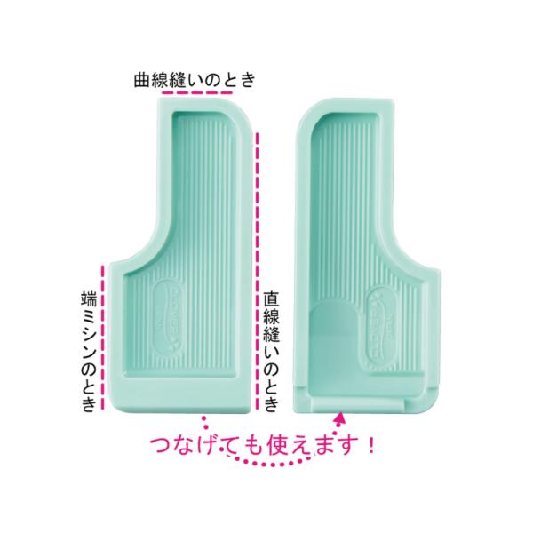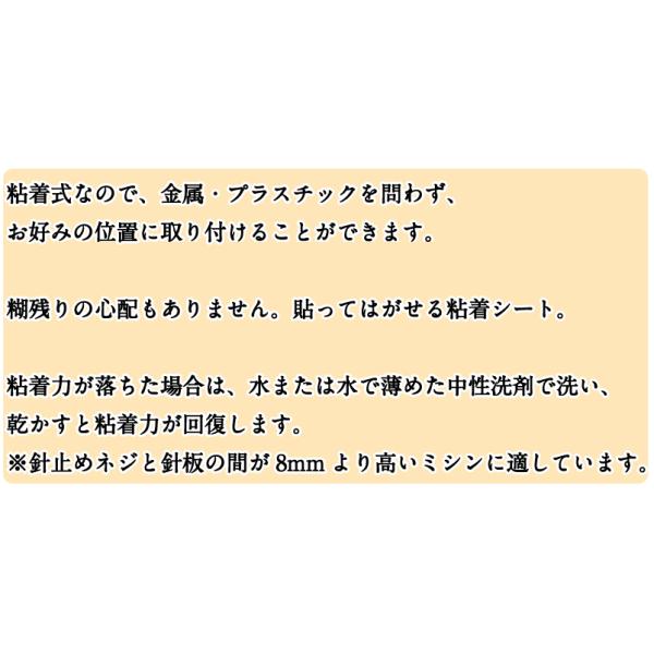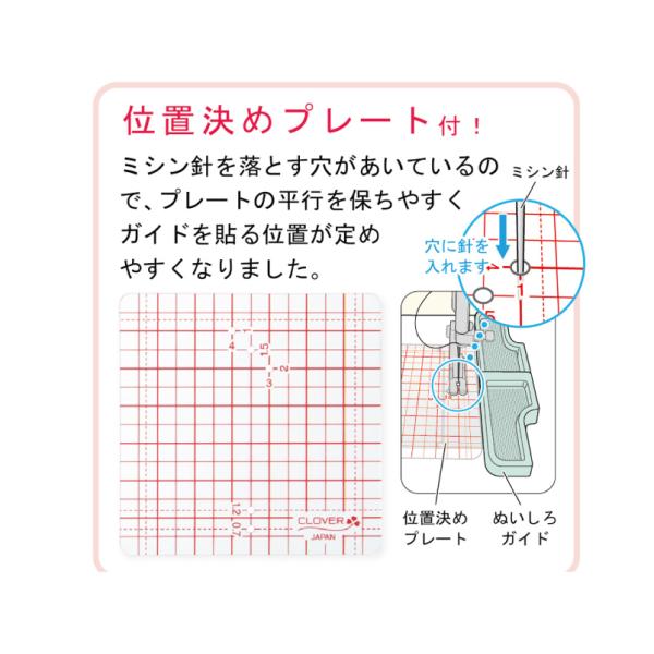 ミシン針を落とす穴があいている位置決めプレート付で、ガイドを貼る位置が定めやすいです。