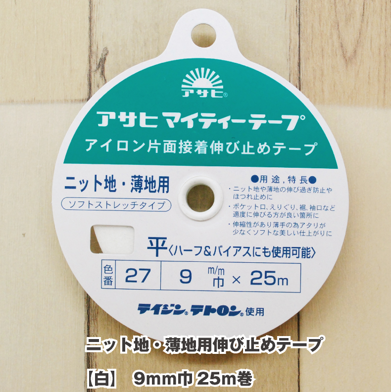 ニット地・薄地用伸び止めテープ【白】 9mm巾 25m巻 片面アイロン接着 アサヒ マイティーテープ 肩線 ポケット 襟ぐり 袖繰り 補強 接着芯 生地 布 和洋裁用品 和洋裁材料