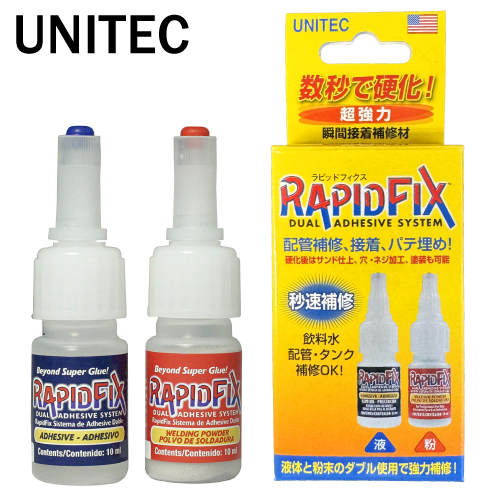 ラピッドフィックス 瞬間接着補修材 瞬間接着剤液+粉末(ガラス酸化物)セット ユニテック 秒速 超強力 金属 ゴム 木材 陶器 ガラス