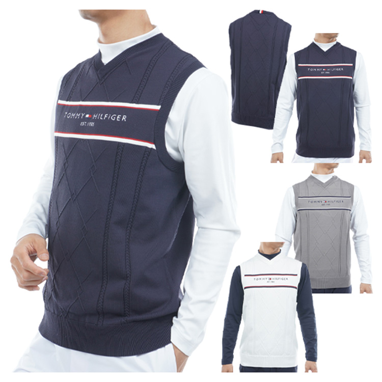 トミーヒルフィガー ゴルフ ベスト メンズ ニットベスト セーターベスト Vネック 軽量 ゴルフウェア ブランド ケーブル柄 ライン 春 秋 冬 THMA560
