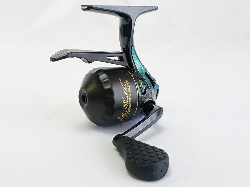 Lew's ルーズの小型アンダースピンリール、ウォーリーマーシャル シグネチャーシリーズ Wally Marshall Signature Seriesです。型番はWMUSCです。ベーシックモデルのクラッピーサンダーの上級モデルで、ドライブギアにベアリングが追加され、センターシャフトに逆転防止のローラーベアリング(IAR ワンウェイクラッチ)が封入されています。このリールはゼブコの33TマイクロゴールドのOEMモデルで、若干軽くなっていますがスペックはほぼ同じです。2+1の3べアリングで、ラインキャパシティはUSA-4Lbs(約1.5号)が90yds(約82m)です。ギア比は4.3:1で、ハンドル1回転当たり巻上量は16インチ(約40.6cm)です。ボディ高は約91mm、ボディ長さは約72mm、重さは168g(ライン含)です。セラミック製デュアルピックアップピン、インスタントアンチリバースを採用しています。ハンドルは左右共用です。USA6Lbsのナイロンラインが巻いてあります。並行輸入品ですので国内保証書は付きません。包装はブリスターパックになります。