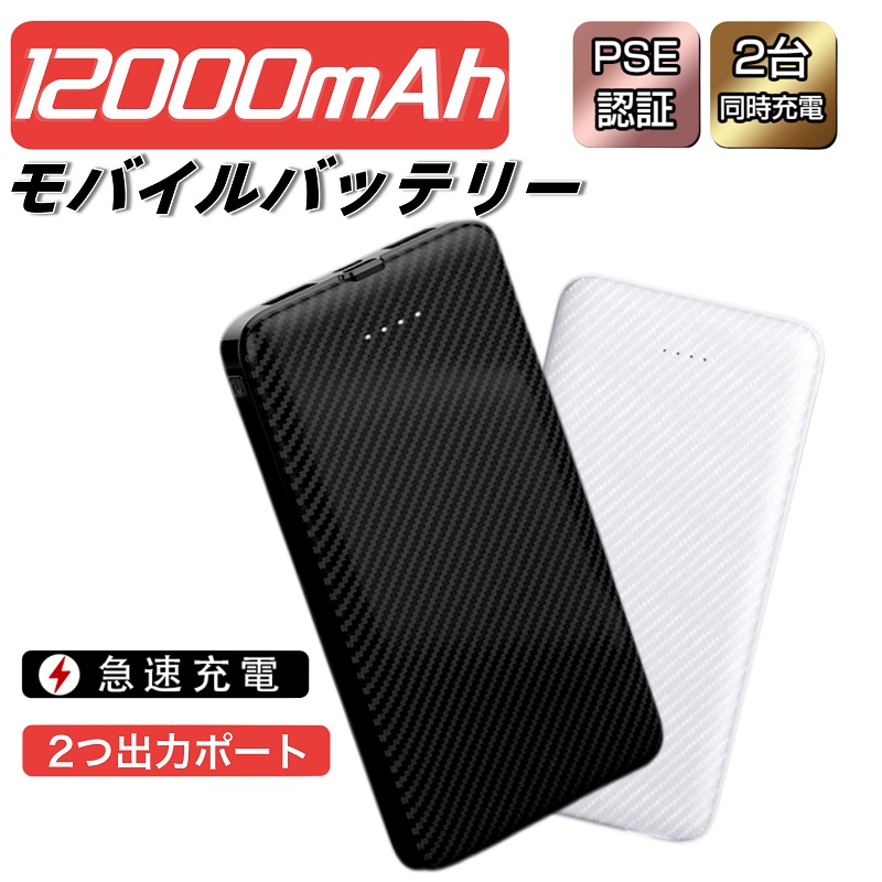 モバイルバッテリー 12000mAh 大容量 軽量 2A急速充電 2台同時充電可能 PSE認証済 iPhone iPad Android 対応