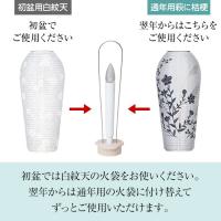 初盆には白紋天の火袋をお使いください。翌年のお盆からは通年用の火袋に付け替えてお飾りください。