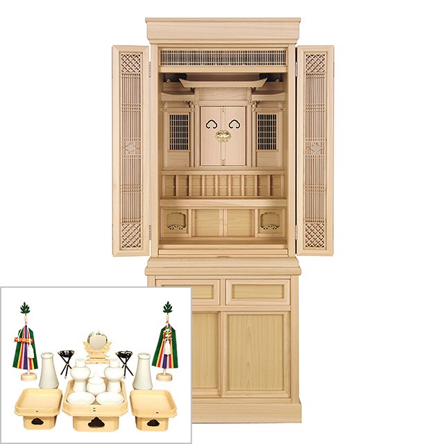 お祀りに便利なスライド式の棚板と、収納に便利な引き出しが付いています。
