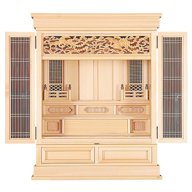 お祀りに便利なスライド式の棚板と、収納に便利な引き出しが付いています。