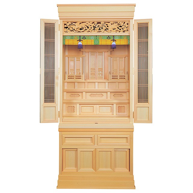 お祀りに便利なスライド式の棚板と、収納に便利な引き出しが付いています。
