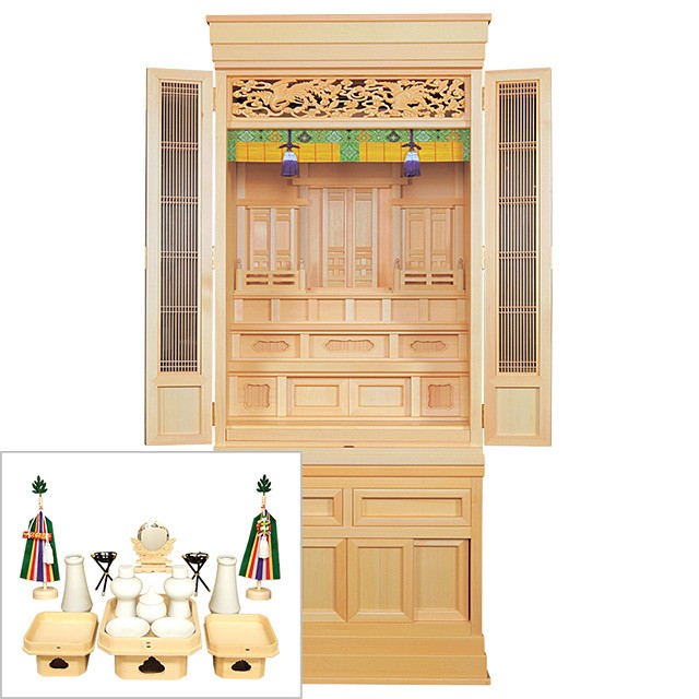 祖霊舎 神徒壇 新白雲(しんはくうん) 台付型 57号(木印) みす付き 神具セット付き (御霊舎 祭壇宮) 国産(日本製)