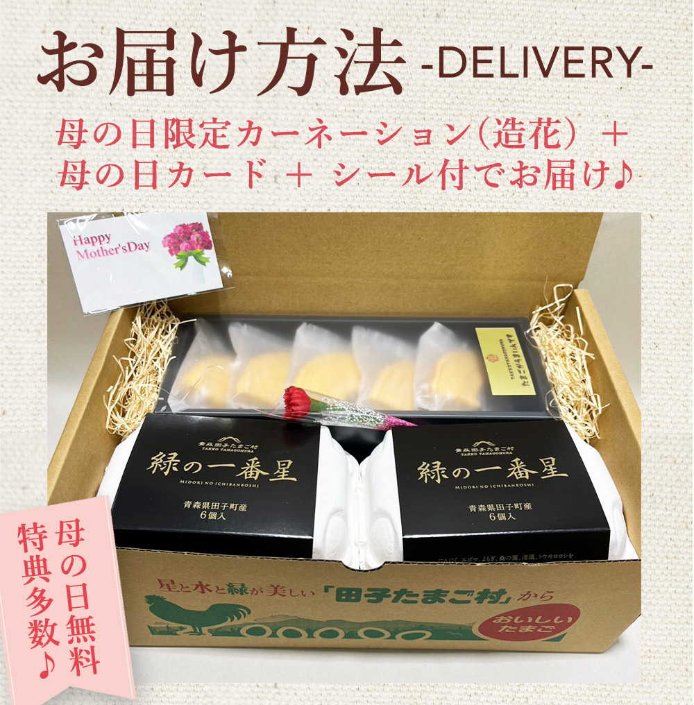 | 内容量 | 卵たまごバウム(16g)5個+ 緑の一番星6個+選べる1箱(緑の一番星・有精卵・にんにく卵 各6個の中から1箱) |