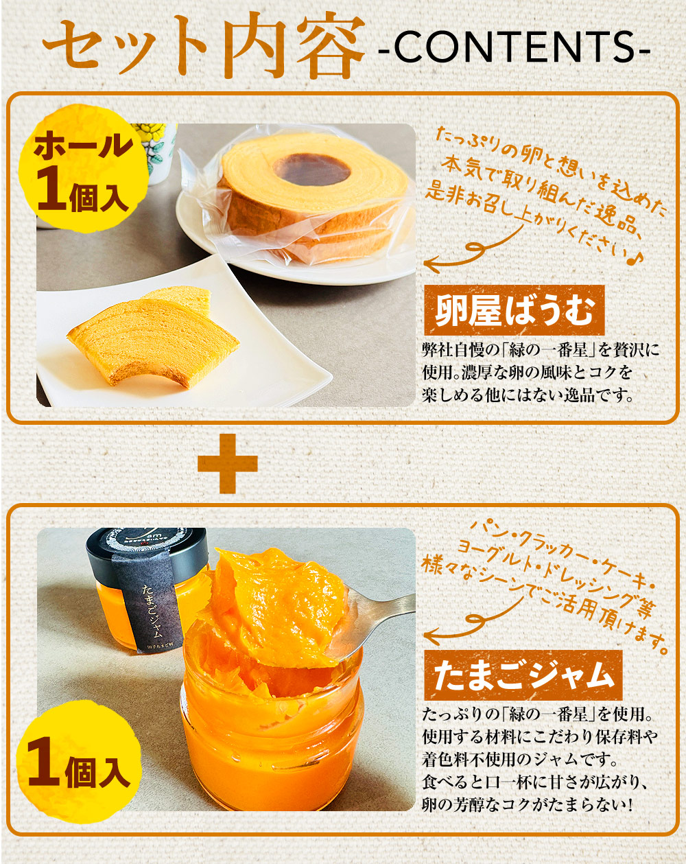 | 内容量 | 卵屋ばうむ:230g(ホール)×1個 たまごジャム: 140g×1個 |
