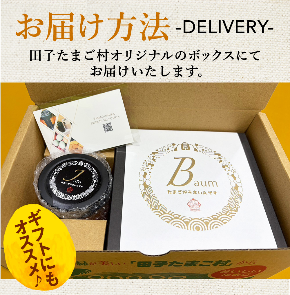 | 保存方法 | 卵屋ばうむ:直射日光を避け、常温で保存 たまごジャム:冷暗所保管・開栓後要冷蔵 |