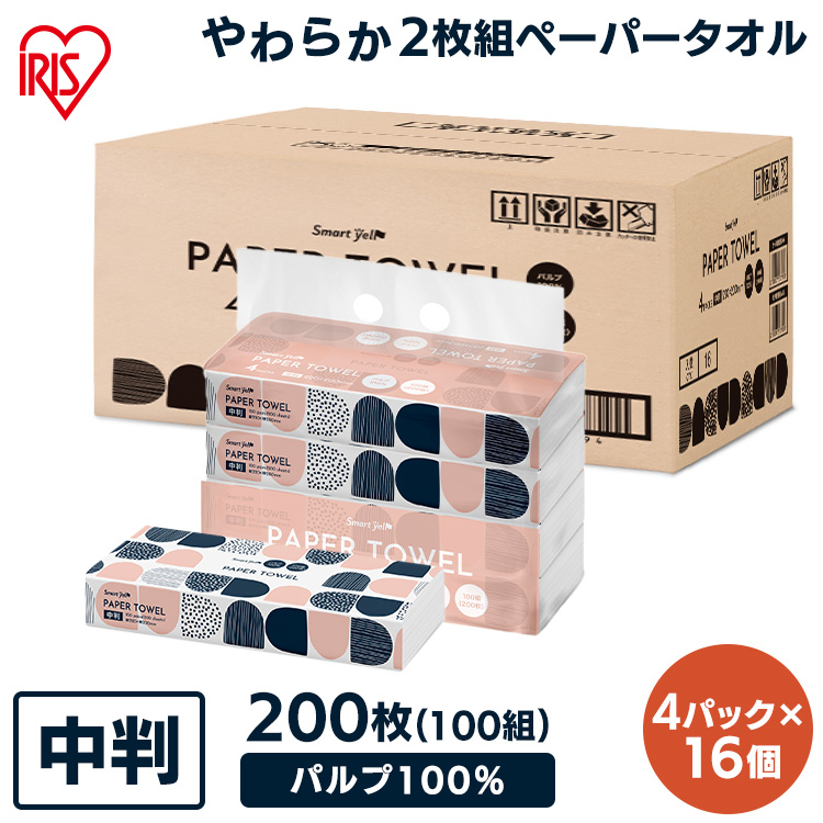 ペーパータオル 中判 業務用 100組 (200枚) 4パック 16個セット (64パック) ハンドタオル 紙タオル 手拭きタオル 手拭きペーパー パルプ まとめ買い 日用品