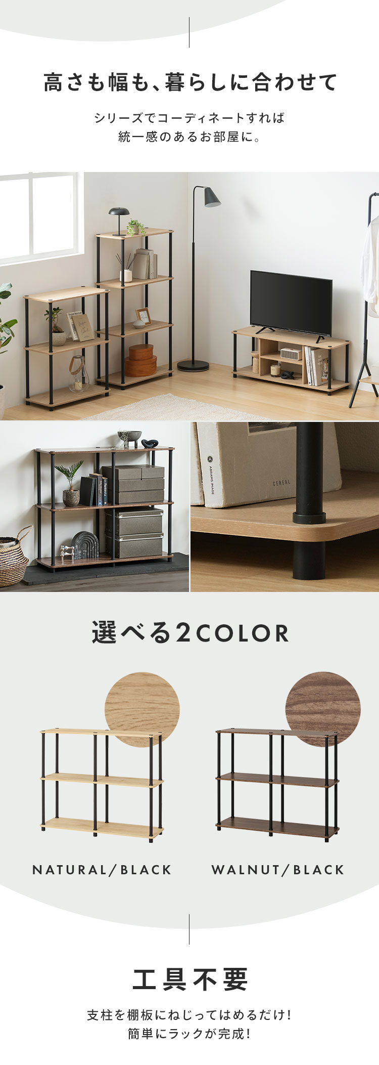 ブラックスチールとあたたかな木目調の木材の組み合わせで、スタイリッシュなお部屋を演出します。