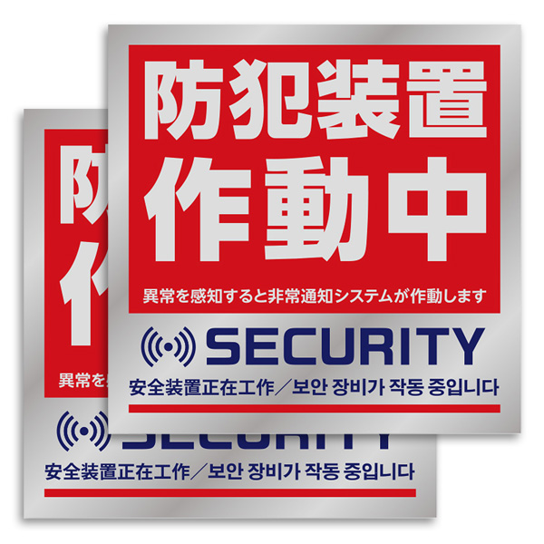 防犯装置作動中ステッカー 2枚 10cm x 10cm 目立つシルバーステッカー 3か国語 日本語 中国語 韓国語 定形外発送